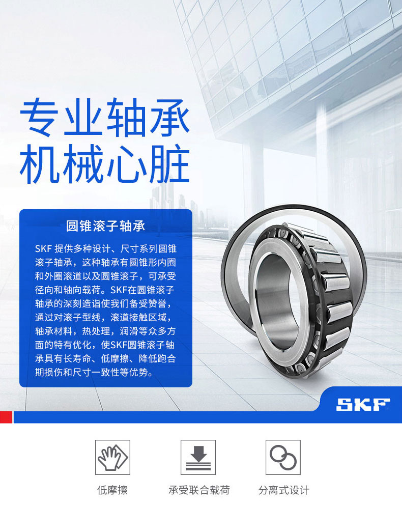 SKF圆锥滚子轴承,可以分离,由内圈与滚子、保持架一起组成的组件和外圈可以分别安装。 产品特性: 滚子和滚道接触处修正的接触线可以减少应力集中。SKF圆锥滚子轴承可以承受大的径向载荷和轴向载荷。